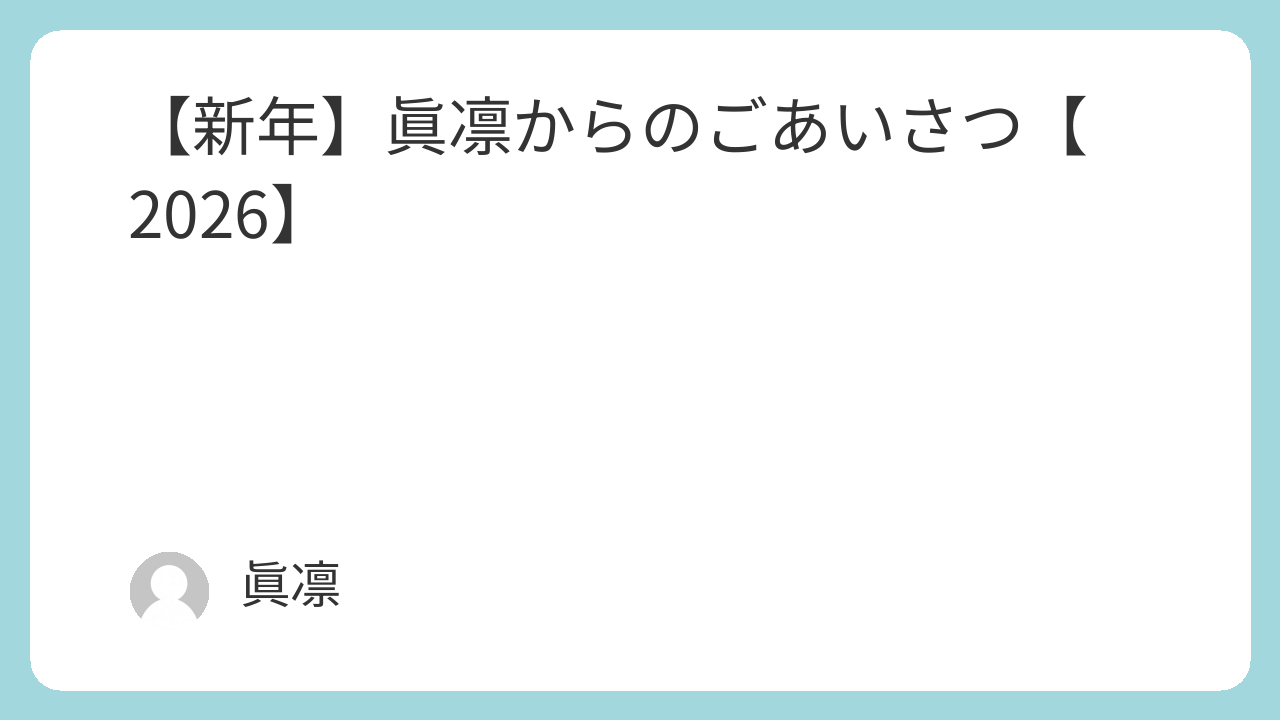 日常 【新年】眞凛からのごあいさつ【2026】 新年、あけましておめでとうございます。去年はブログをあまり更新できなくて、申し訳ないです。今年の目標ですが、僕自身だと、『後回しにしない』です。僕は何をやるにも後に回してしまう癖があるので、今年はその癖を直していきたいです。また、このブログ... 2026.01.01 日常